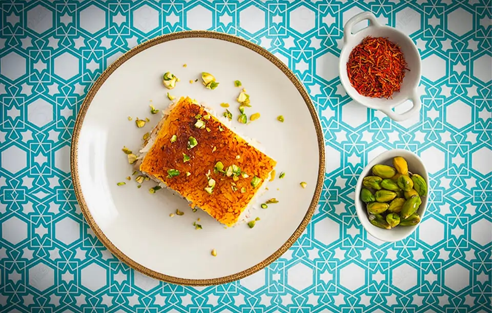 3. Tahchine Morgh: Layered Saffron Rice Cake